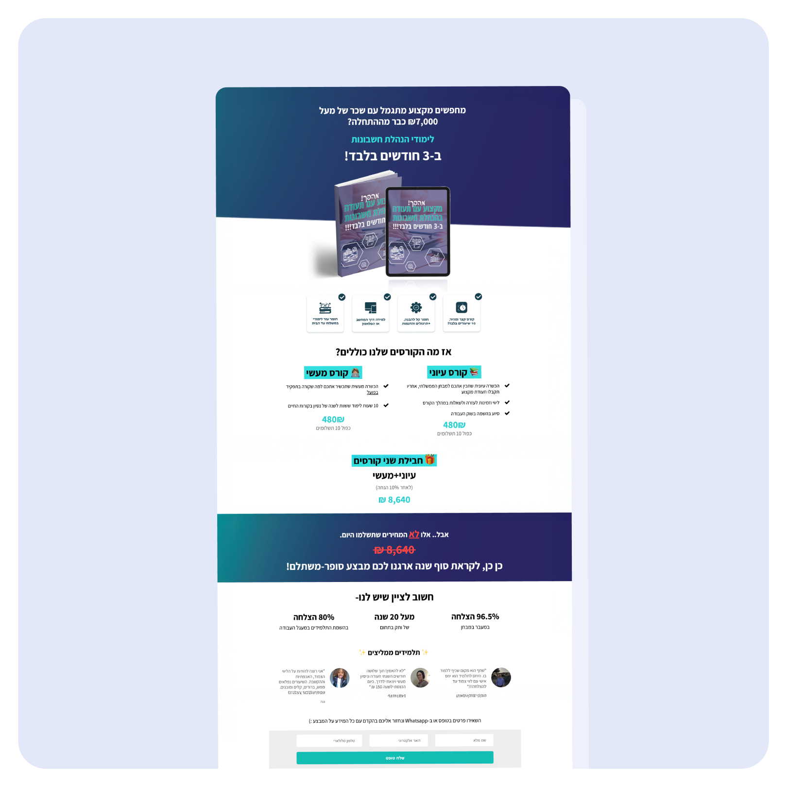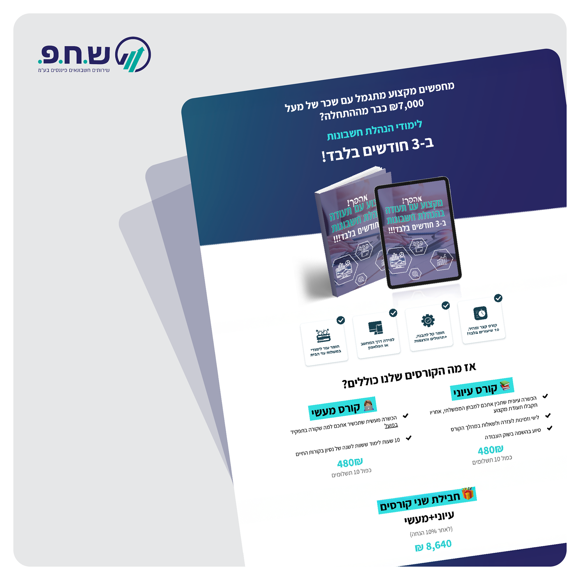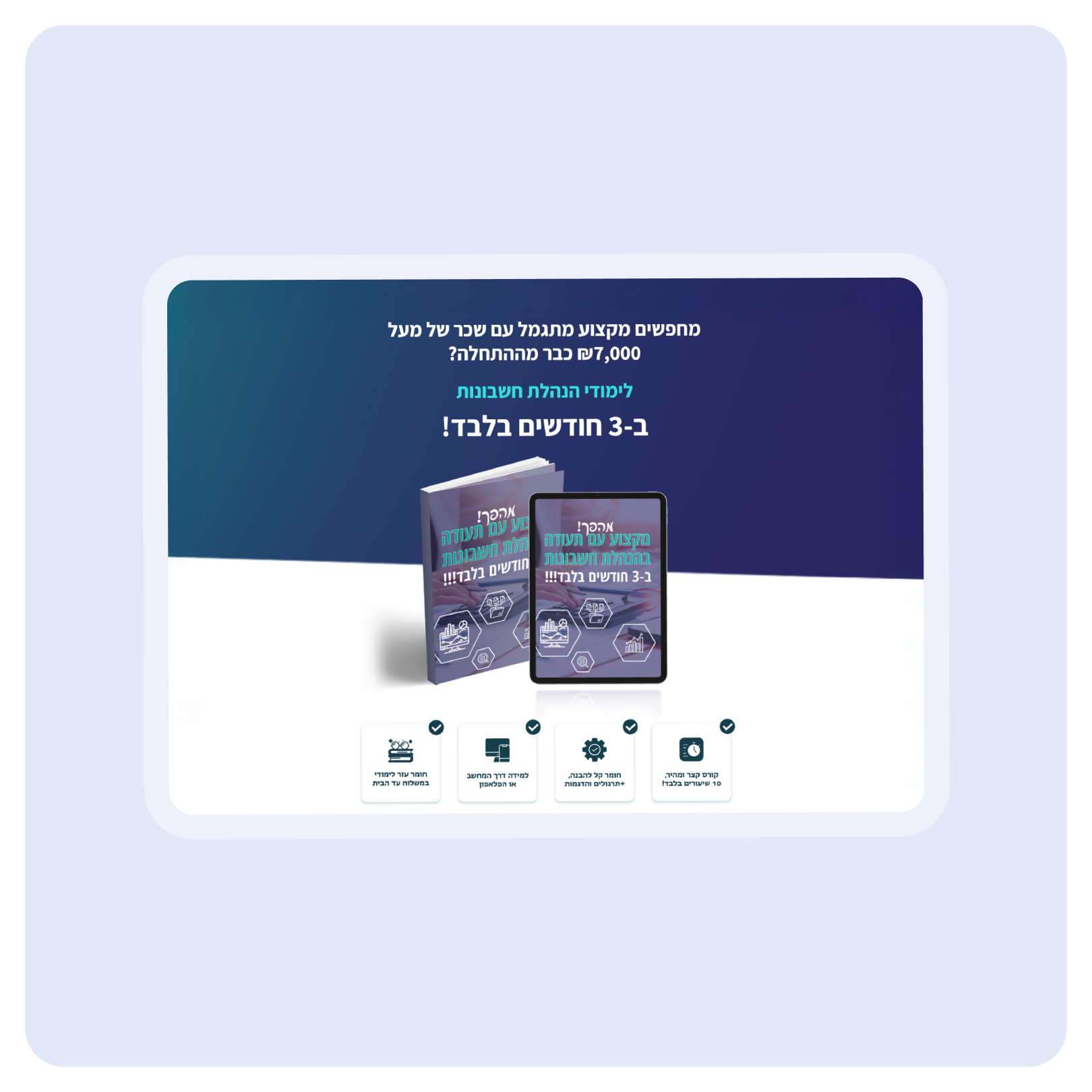 עמוד מבצעי סוף שנה לקורס הנהלת חשבונות. העמוד מציג את ההטבה, מפרט את יתרונות הקורס והמסלול המקצועי, ומוביל את המשתמשים לרכישה באמצעות מבנה נקי, קריאות גבוהה וקריאה לפעולה בולטת