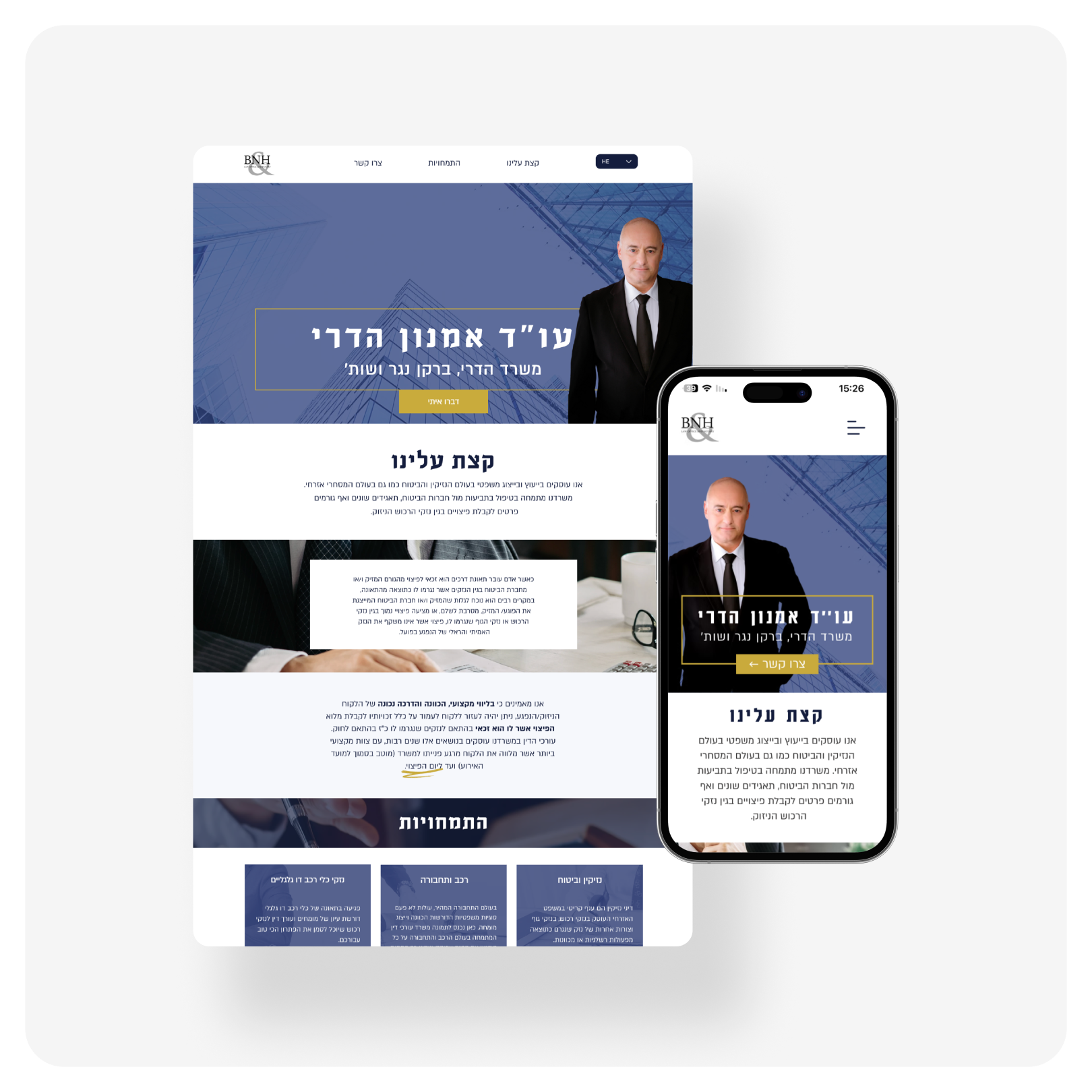 עיצוב אתר תדמית עבור משרד עורכי דין, בקו מקצועי ונקי, המדגיש את תחומי ההתמחות של המשרד ואת ערכיו. המבנה האינפורמטיבי והיררכיית התוכן מסייעים ללקוחות פוטנציאליים לאתר מידע רלוונטי בקלות וליצור קשר באופן ישיר ונוח