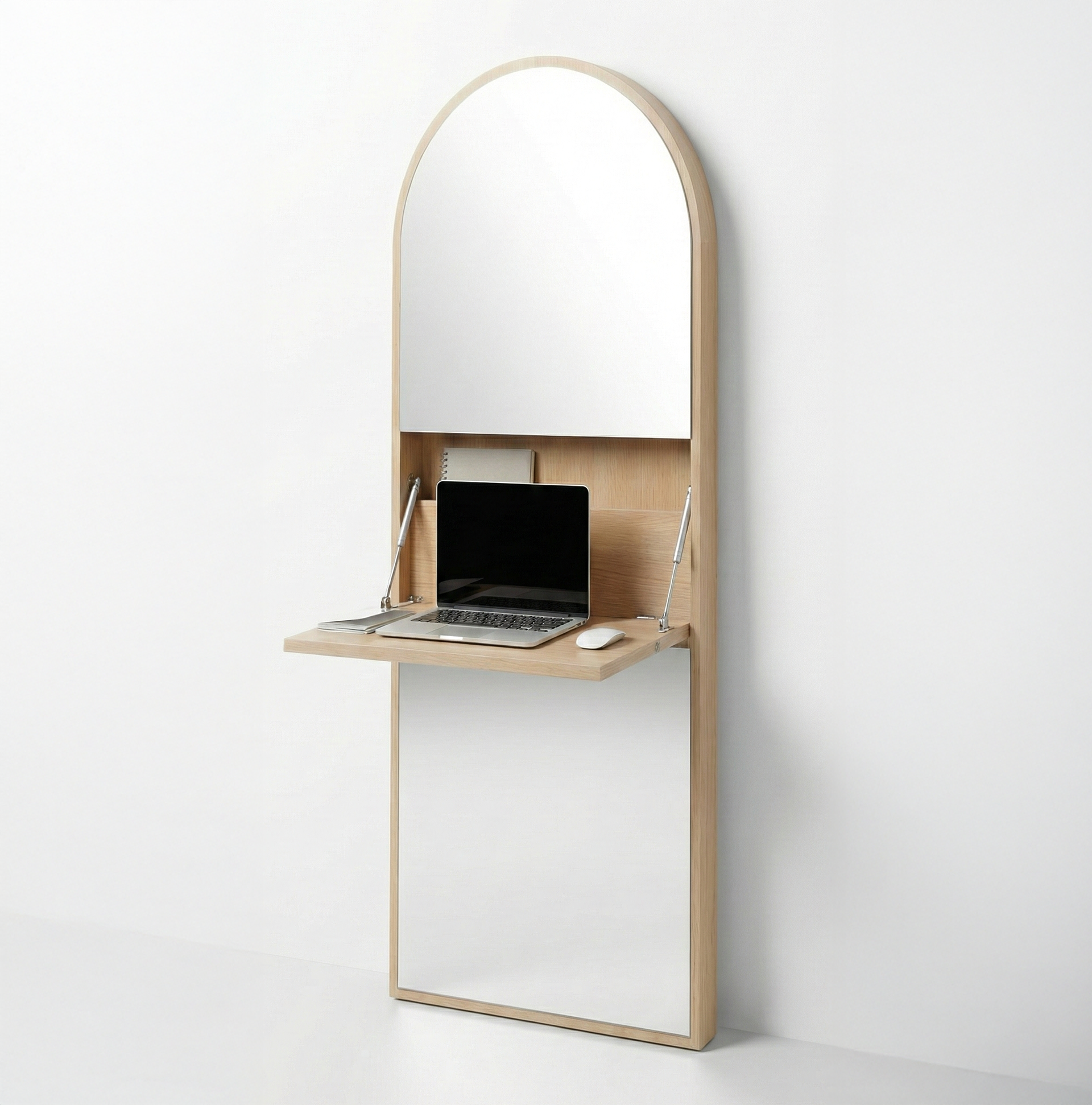 This bedside is part of a collection of four. It features a hidden mirror behind a door, ensuring it can only be used when the surface is clear.