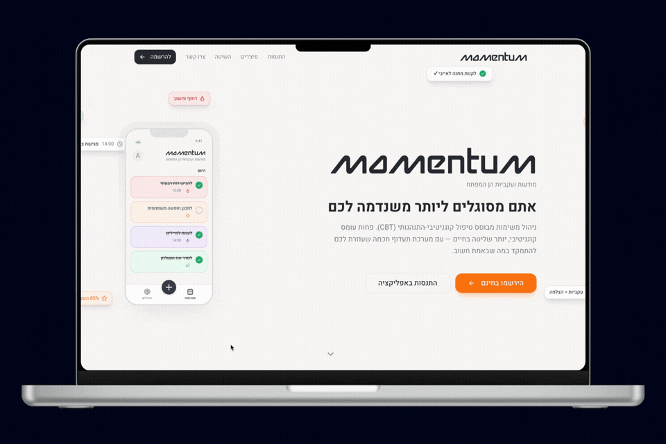 השלב האחרון היה בניית עמוד כניסה מרשים שנועד להמחיש את ערך המערכת ולהפוך מבקרים למשתמשים רשומים. העמוד כולל אזור התנסות חיה המאפשר למשתמשים לנסות את ניהול המשימות והתיעדוף עוד לפני ההרשמה, לצד גלריה נעה המציגה את היכולות המרכזיות של האפליקציה בליווי הנפשות קצרות. בנוסף, שילבתי הסבר מעמיק על השיטה הפסיכולוגית של תיעדוף נכון להפחתת חרדה, וכל זאת בעמוד דינמי ליצירת חוויה מניעה לפעולה