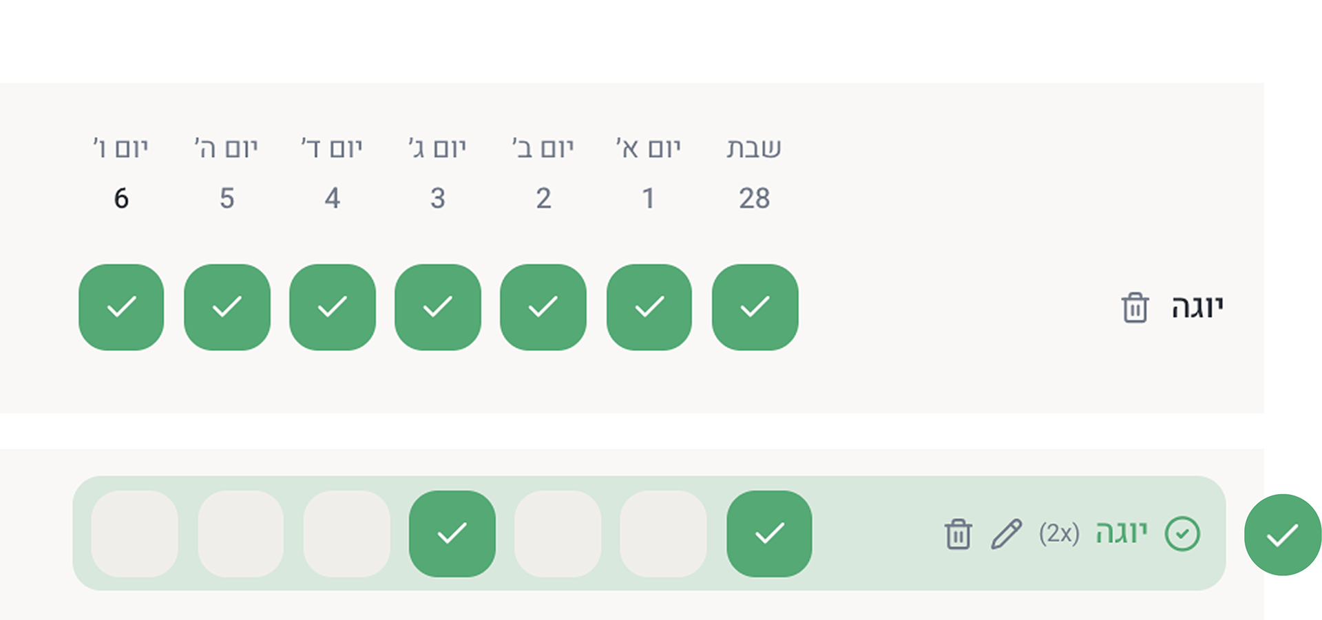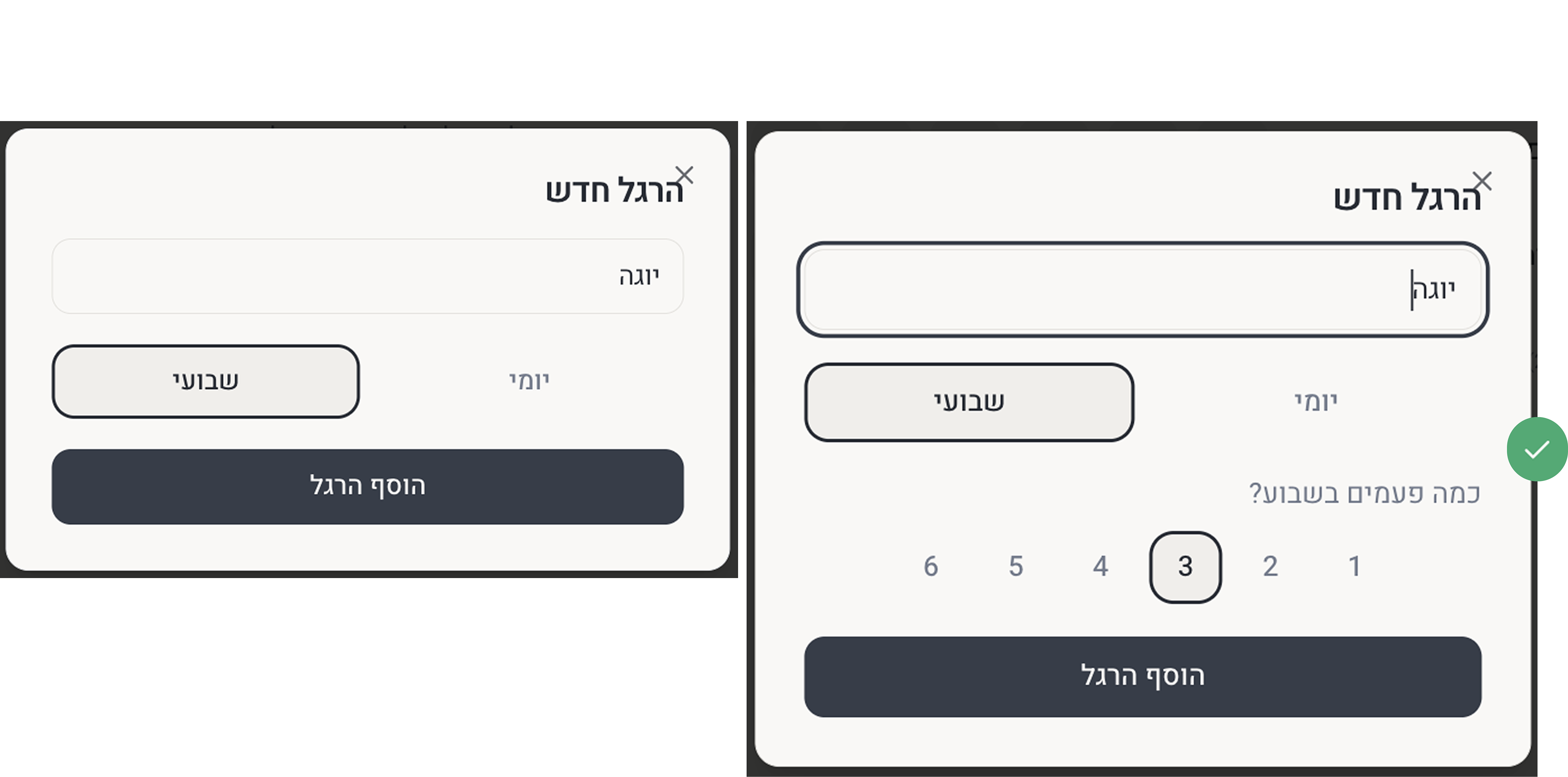 גמישות בתזמון ותדירות: הגדרת הרגלים על בסיס יומי או על בסיס שבועי עם אפשרות לקבוע מראש את מספר הפעמים הנדרש לביצוע