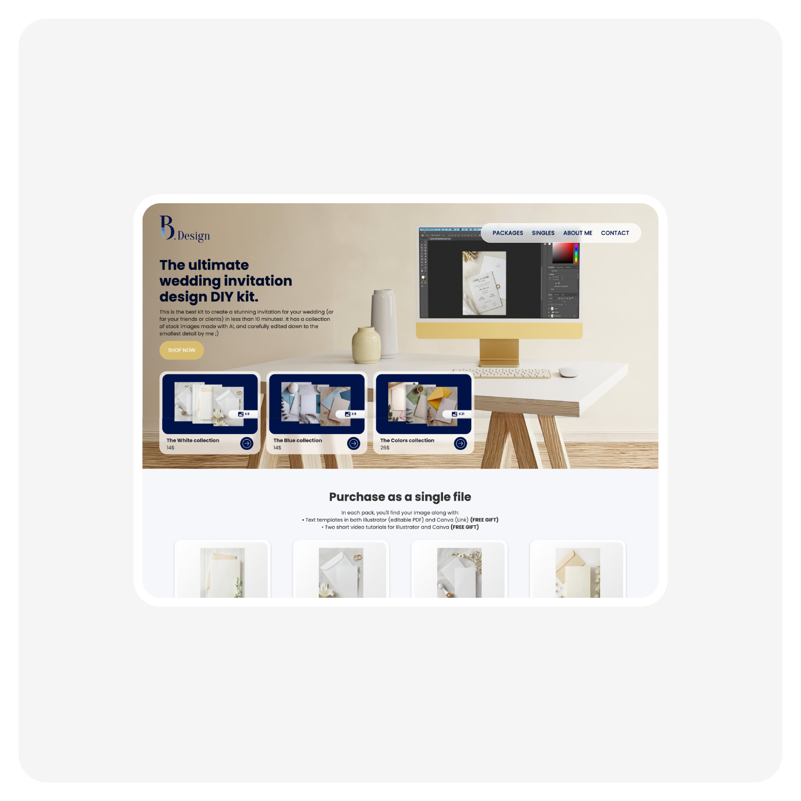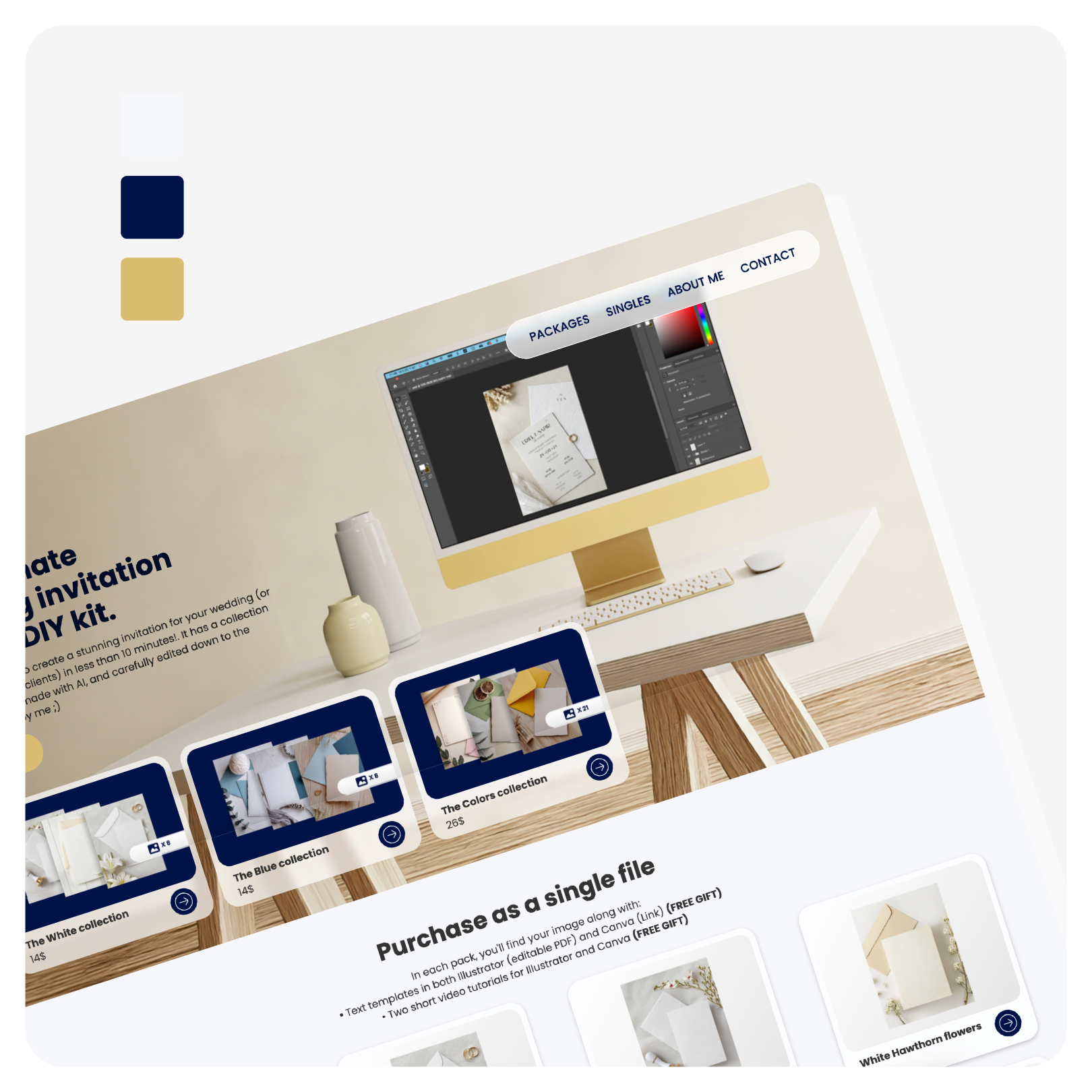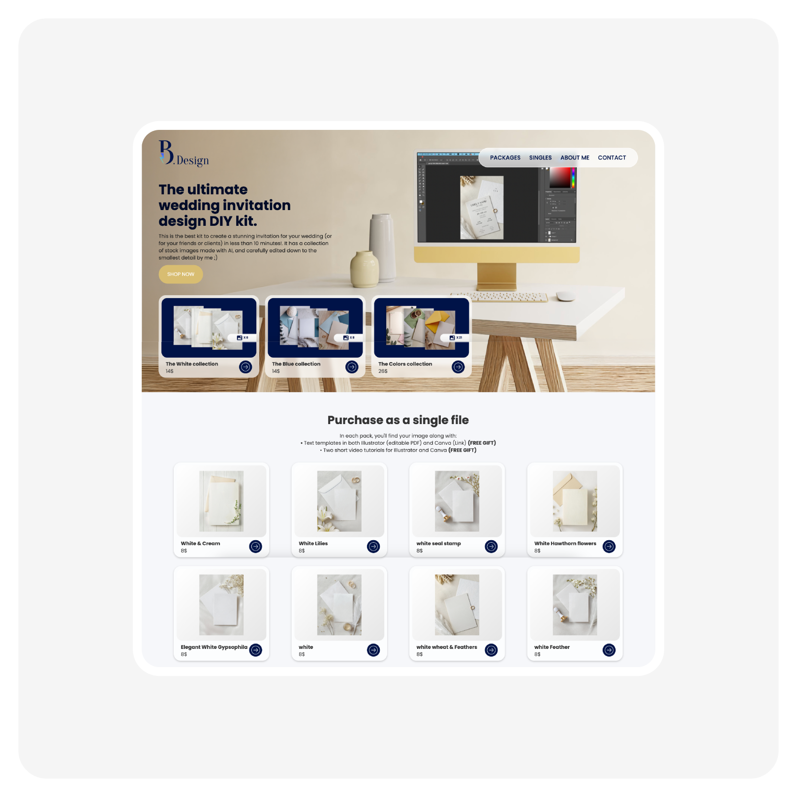 אתר חנות לקיט דיגיטלי שמאפשר לכל אחד לעצב הזמנות חתונה מרהיבות תוך דקות בין אם הוא מעצב מקצועי, חובב עיצוב, או פשוט צריך הזמנה מהירה ויפה לאירוע קרוב. באתר ניתן לרכוש עיצוב יחיד שמגיע עם שלוש תבניות טקסט, או חבילת עיצובים שלמה